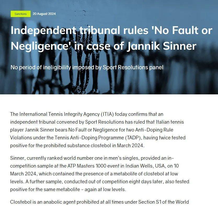 ATP(国际职业网球联合会)也在去年8月20日发布公告称,辛纳在该事件中没有过错,因此他不会遭受禁赛处罚。